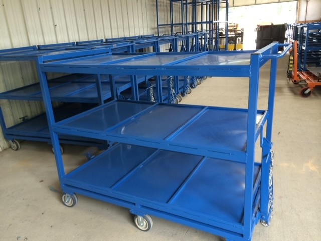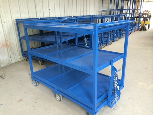 Tote carts are made of high quality steel. They sit on six castor wheels. They feature three flat shelves, each shelf is divided into three equal sections. These tote carts include a tounge and hitch on each side, making towing easy. These carts are known for thier impressive turns and smooth stability.